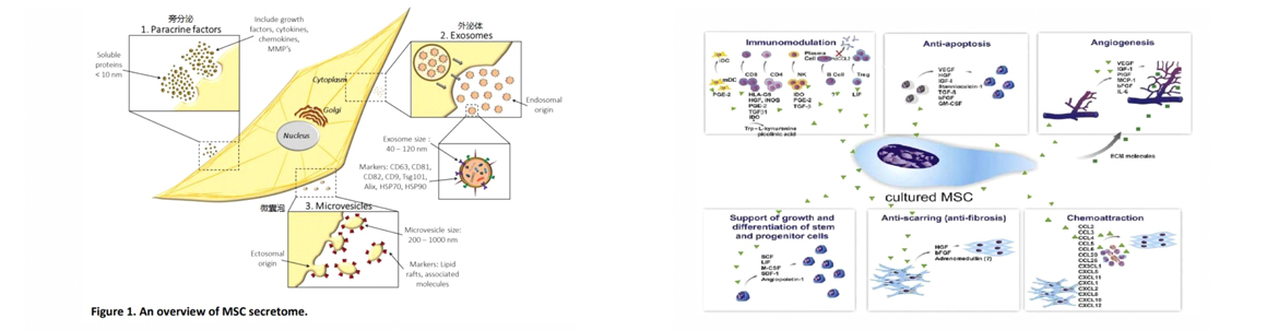 主要分泌:免疫調(diào)節(jié)因子、抗凋亡因子、促血管形成因子、促組織前體細(xì)胞增殖和分化因子、抗纖維化因子、趨化因子等。