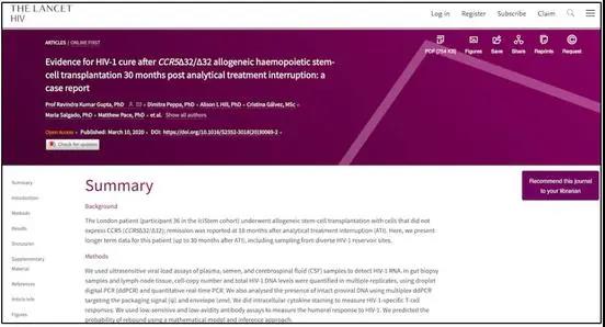 《柳葉刀》發(fā)文確認(rèn)利用CCR5突變的造血干細(xì)胞移植治愈了世界第2例艾滋病,該案例為今后相關(guān)療法的臨床實(shí)施提供了經(jīng)驗(yàn)和指引。