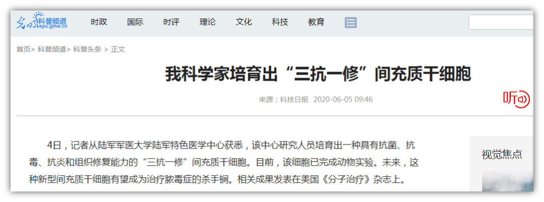 陸軍軍醫(yī)大學(xué)陸軍特色醫(yī)學(xué)中心培育出一種具有抗菌、抗毒、抗炎和組織修復(fù)能力的間充質(zhì)干細(xì)胞,有望成為治療膿毒癥的殺手锏。